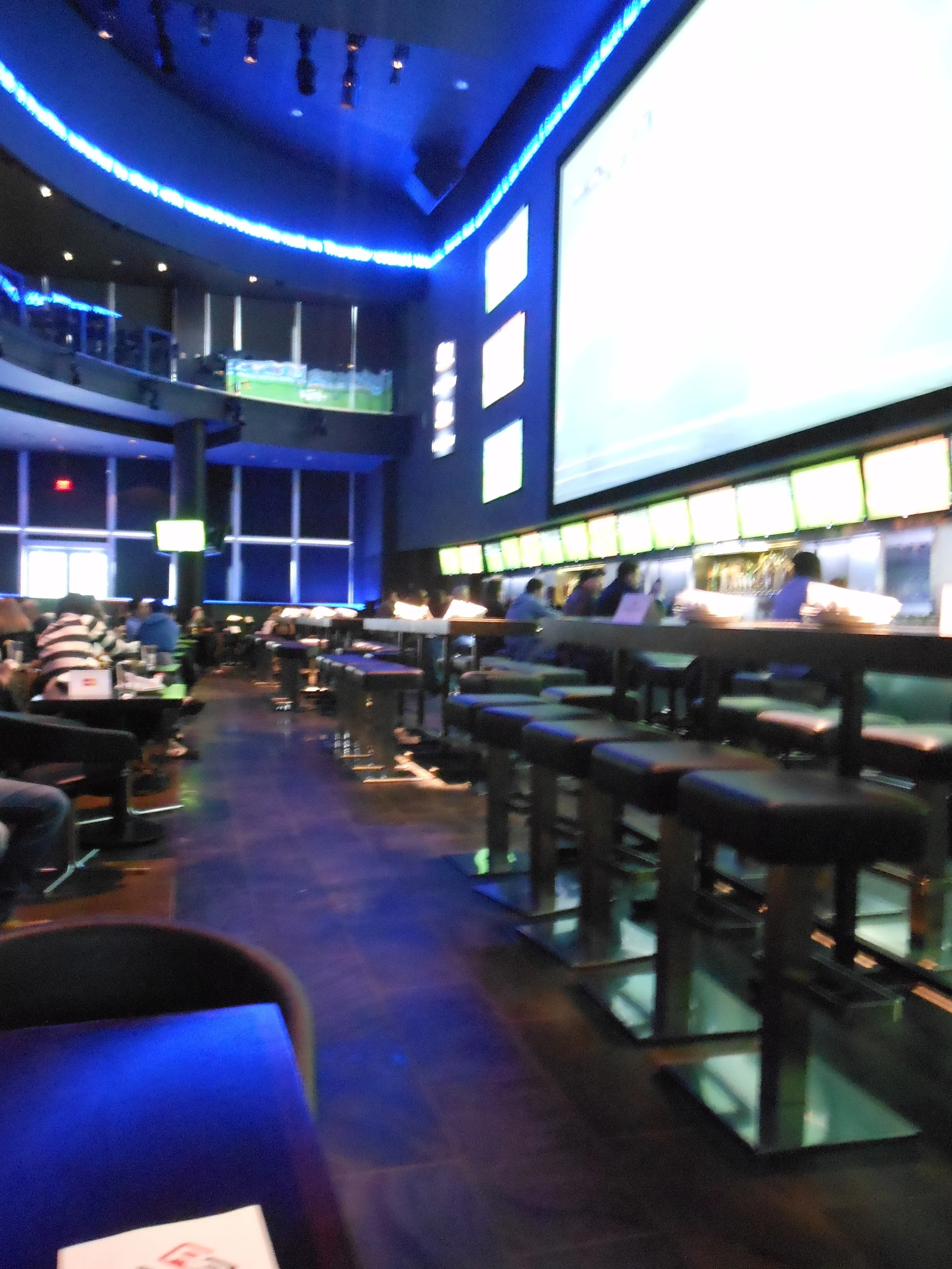 There are three distinct areas to Real Sports: the front room that hosts its own bar and quieter dining area, the bustling main room where the jumbo screens reside, and a second floor dining area with no elevator access. The floor is clear of carpets in all areas except for a few near the washroom where they soak up the winter slush. Both the front room and main room have easy to navigate wide aisles and array of seating options including: 27.5” standard tables, bar height tables, and booths. There is a small step leading up to the booths so I would recommend opting for the standard tables.