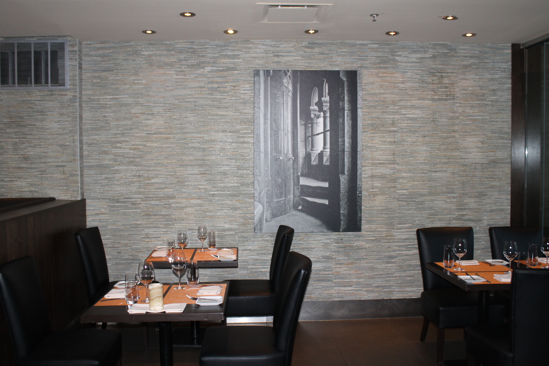The entrance to Mideastro Yorkville is slightly elevated from the sidewalk with a slight incline to the front door. The outdoor patio is small, offering 8 seats, but the tables are easily accessed. You are welcomed into the restaurant by friendly staff via a set of double doors that measure 34 inches each and another 34 inch glass door. There are no automatic door openers. Once indoors, you quickly recognize that space is not an issue! Sleek booth seating line the walls while standard table seating is available in the center and back of the restaurant. There is a private glass room in front of the washrooms that provide the option for a more quieter dining experience.