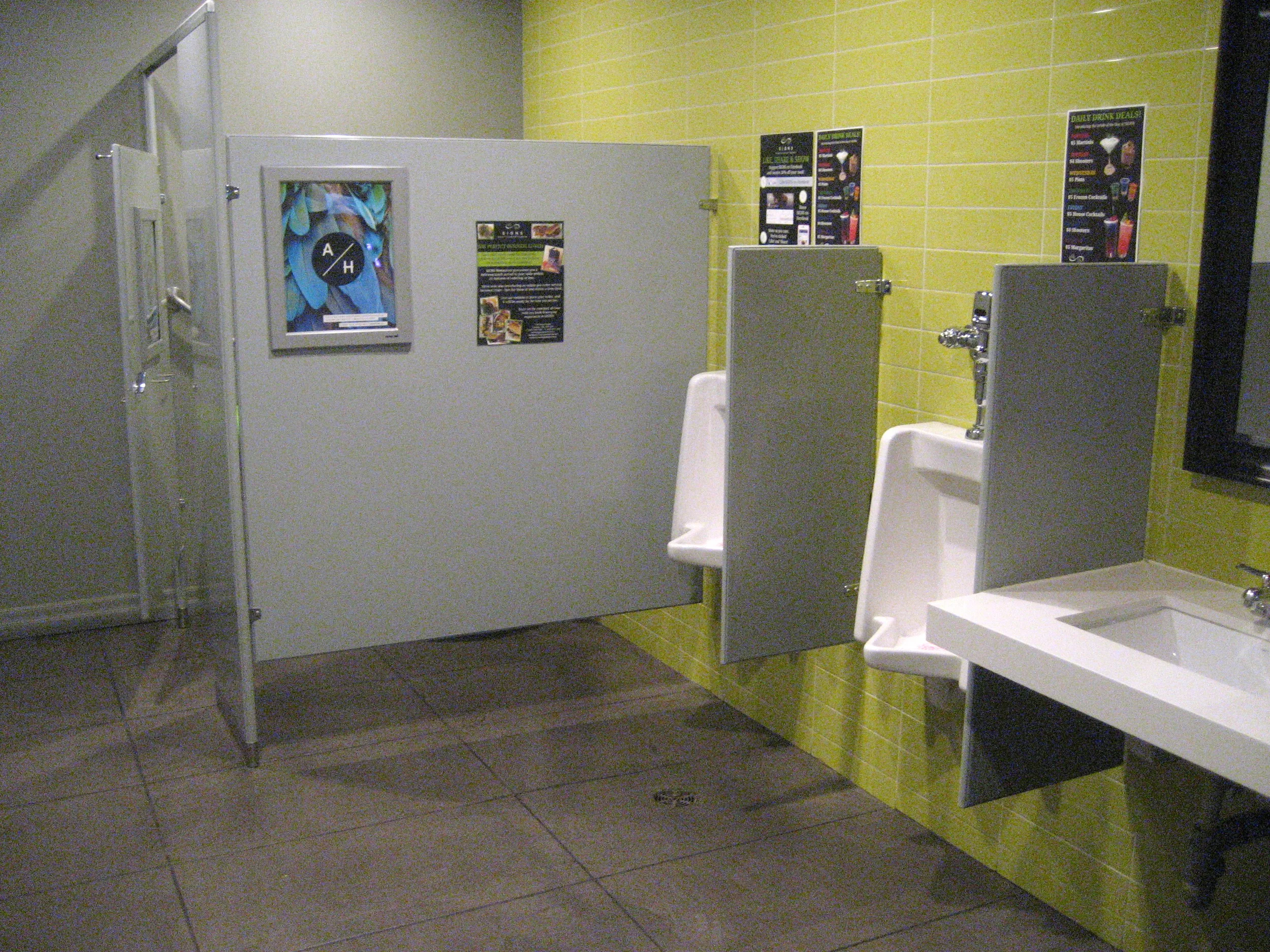 Just past the front dining room and bar area you will find the accessible washrooms. The door to both the men’s and women’s washrooms swing open into a large and open space. There is one accessible stall in each restroom that features a 33” door and two grab bars. Chris commented that the stall door was a bit tight but that he was able to manage once inside. The sink measures 35” high and provides room for a wheelchair to pull in. The toilet, sink and paper towel dispenser are manual.
