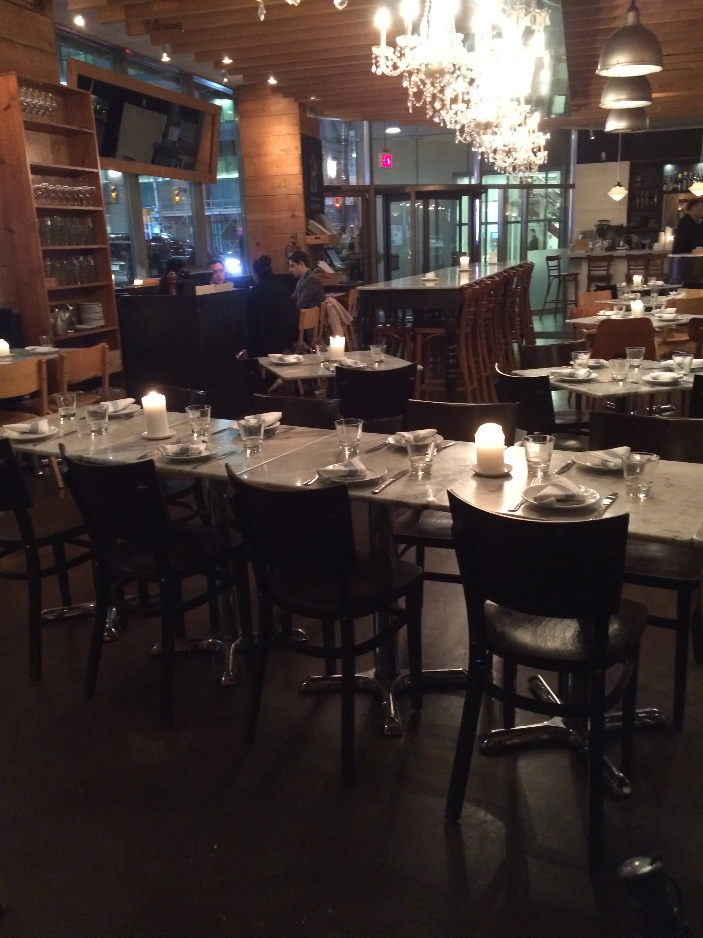 You can enter Mercatto off Bay Street by the 36”wide door to the right of the revolving doors. There is a small ½” lip to transition from the stone walkway and sidewalk onto the smooth floor of the restaurant. In the summer, there is also an accessible entrance to the patio which is just north of the entrance on Bay street. Please note that this is the only accessible entrance to the patio as there are a couple steps to enter from inside the restaurant. Throughout the restaurant, the tables are 29” high with removable chairs. The restaurant is warm and inviting with floor to ceiling windows that face Bay Street. Please note that there is limited clearance between tables, however, some aisles are wider than others.