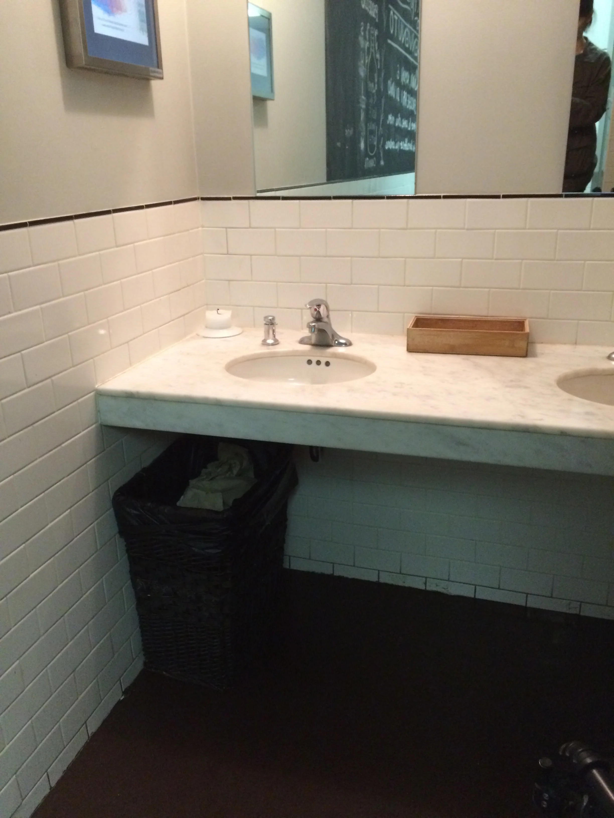 At the back of the restaurant, you will find the hallway to the washrooms which is 40”wide. There are accessible stalls in the male and female bathrooms, with the doors to enter being 32” wide. Note that at the time of the visit, the hallway was dimly lit. The bathroom was equipped with an 18” high toilet surrounded by 2 grab bars, one behind and one beside the toilet. The door to enter the stall was 33.5” wide. The sink is outside of the stall at a height of 33” and 16” deep, with clearance of 29” below. The sink has a single lever to turn on/off, and the soap dispenser is a pump action. The bathroom is also equipped with a baby change table. Part of the bathroom was well lit while the other half near the sinks was not as well lit. As well, the mirrors above the sink did not tilt.